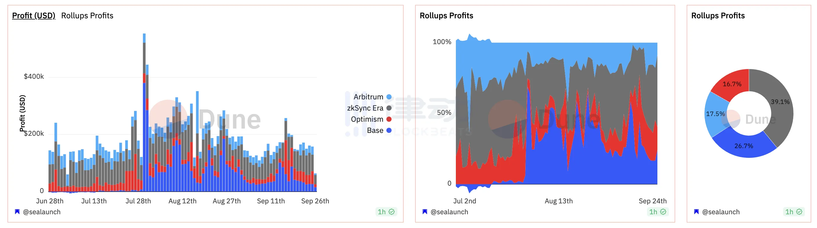 但 Arbitrum 的一系列激励措施并没有为其生态活跃度带来起色。Arbitrum TVL 过去数月没有显著增长,截至目前,根据 L2BEAT 数据显示,Arbitrum TVL 为 56 亿美元,ARB 代币价格为 0.81 美元。另据 Dune Analytics 数据显示,大部分 L2 网络过去两个月都表现出收入增长乏力,其中 Arbitrum 收入占比缩减最为明显。