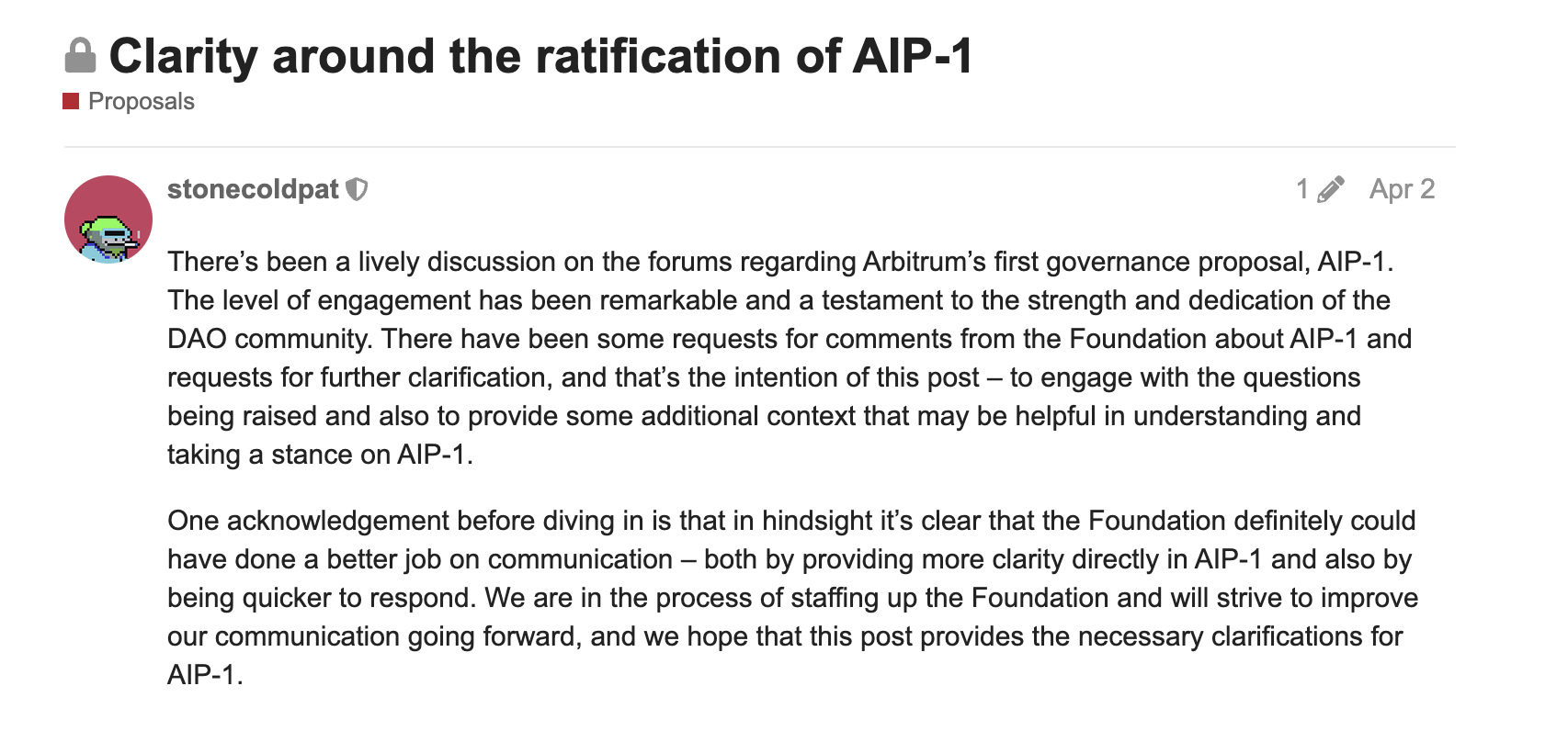 4 月 3 日,Arbitrum 官方在社交媒体上针对近日社区热议的「基金会在 Aip-1 提案未获投票通过前卖币」一事做出回应表示,Arbitrum 的去中心化治理正按照原本的计划进行,但很多决定必须在 DAO 正式启动之前就做出。