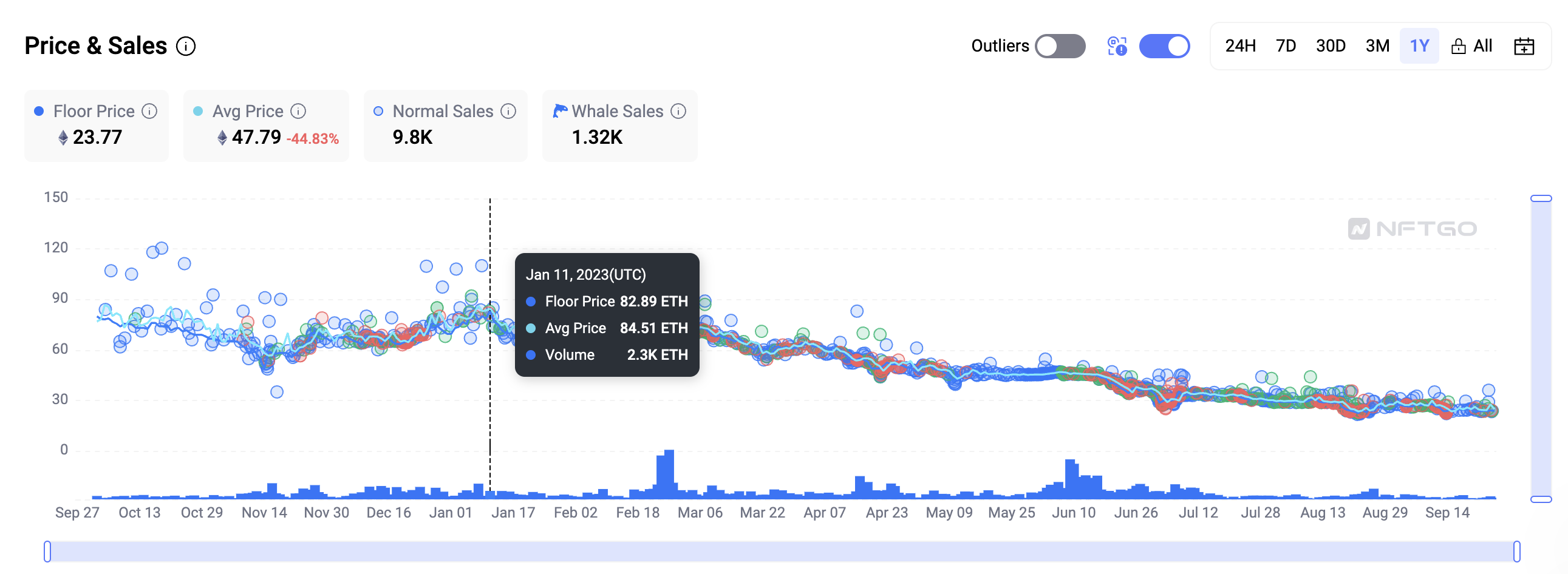 截至目前,根据 Blur 数据,BAYC 当前地板价为 23.77 ETH,较去年高点下跌超 70%。
