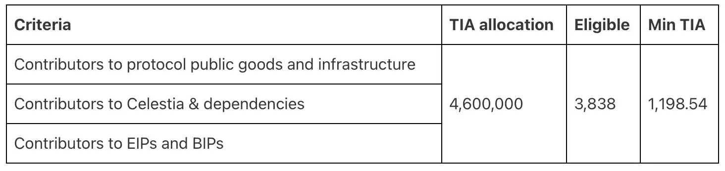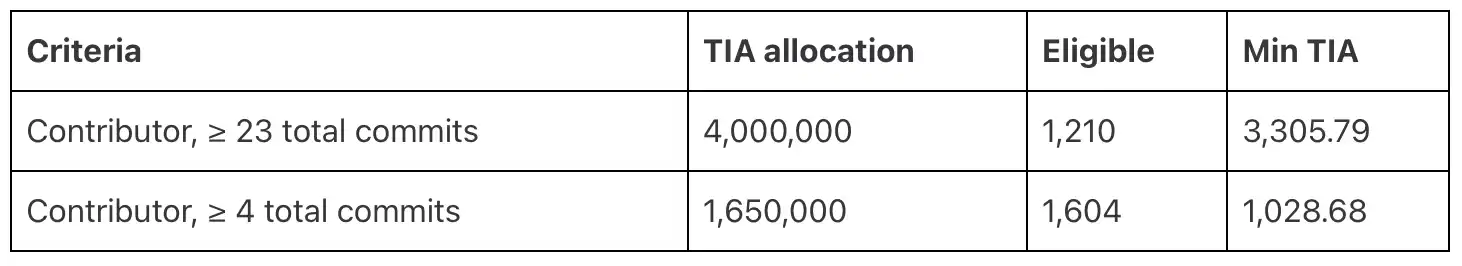 额外的 TIA 分配给在所有合格存储库中总共至少有 4 次提交的 Github 贡献者,甚至更多的 TIA 分配给在研究和公共产品以及早期模块化生态系统标准中总共至少有 23 次提交的贡献者。