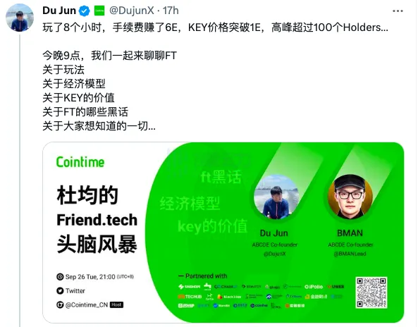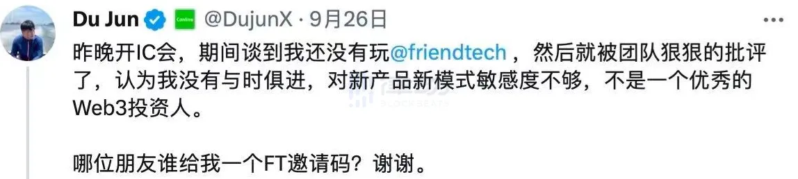 前 Huobi 联合创始人、ABCDE 合伙人杜均则在 9 月 26 日一天内接连发布两条与 Friend.tech 相关的动态。一条表示自己因为没有关注 Friend.tech 而被团队「狠狠地批评」,并向社区询问该应用的邀请码;