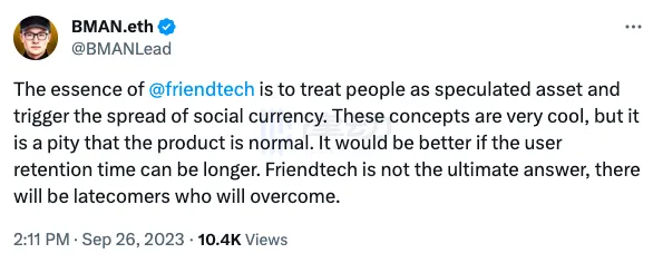 ABCDE Capital 合伙人 BMAN 昨日在推文中写道:「Friend.tech 的本质是将人当作投机资产,引发社交货币的传播。这些概念很酷,可惜产品一般。如果用户留存时间能够更长一些就更好了。Friendtech 并不是最终的答案,会有后来者克服的。」