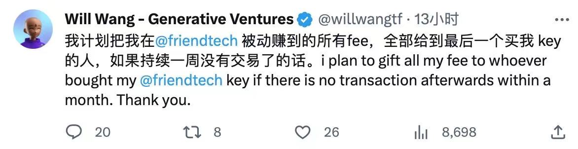 贝塔斯曼合伙人汪天凡在自己的 X(原推特)中表示,如果自己的 key 持续一周没有交易了的话,就将其被动赚到的所有 fee 给到最后一个买他的 key 的人。