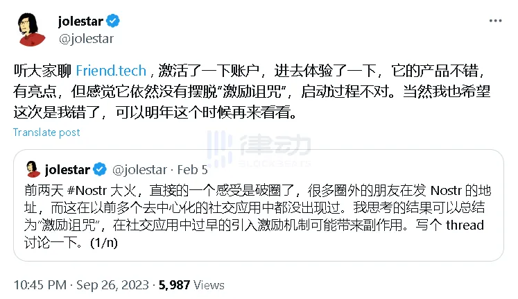 X 用户 @jolestar 受社区影响,尝试体验 Friend.tech 后在动态中表示,「Friend.tech 产品不错,有亮点,但感觉它依然没有摆脱「激励诅咒」,启动过程不对」。