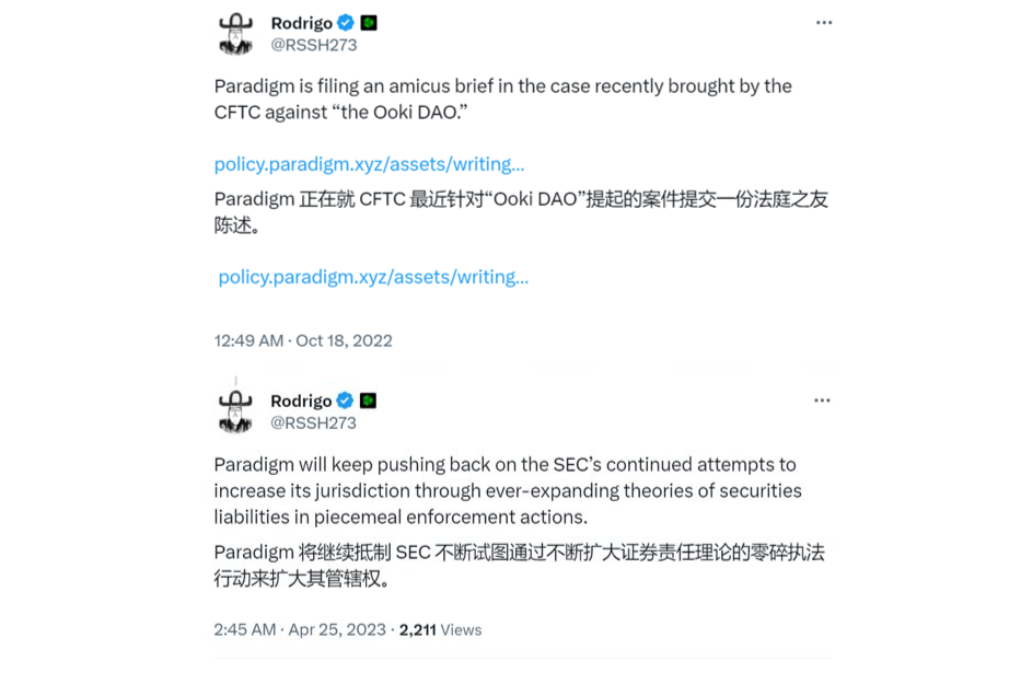 曾报道,2022 年 10 月,Paradigm 提交法庭顾问简报声援 Ooki DAO。今年 4 月 25 日,Paradigm 法律负责人 Rodrigo 又表示,为避免 SEC 将稳定币定义为证券,已在 Terra 案中提交法庭之友简报。