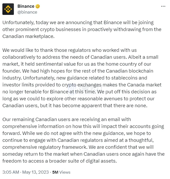 曾于 5 月 13 日报道,Binance 官方账号在社交媒体上发文表示将主动退出加拿大市场,尽管该地区的市场很小,但作为 Binacne 创始人的祖国,它对 Binance 来说具有情感价值。当加拿大用户再次可以自由访问更广泛的数字资产套件时,Binance 将会重返加拿大市场。