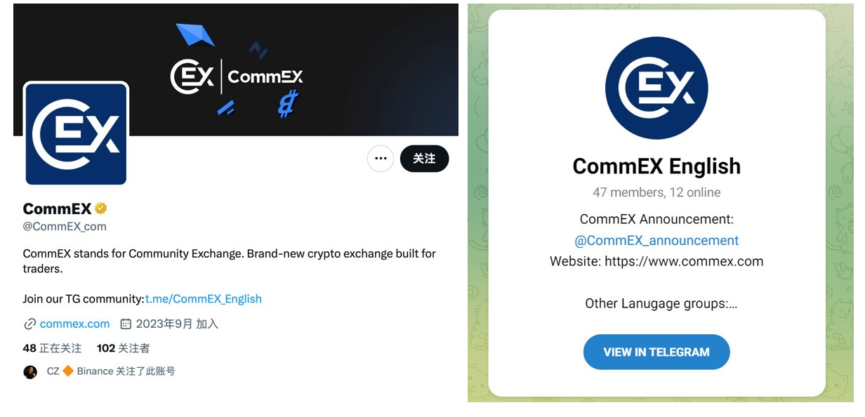 发现,接手 Binance 俄罗斯业务的交易所 CommEX,于昨日晚正式上线。其官方推特账号注册于今年 9 月,截至撰稿时,关注人数仅 102 人,其中行业关注者仅 CZ 一人,唯一一条推文发表于 20 小时前。其次,CommEX 英文官方 Telegram 频道成员不足 50 人。