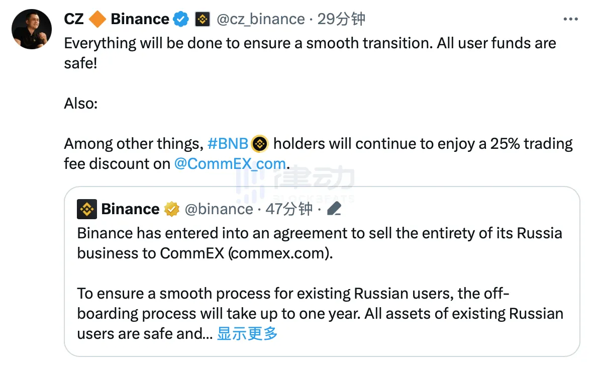 此外,CZ 在半小时前发推称,将尽一切努力确保俄罗斯用户的平稳过渡。所有用户资金都是安全的。此外,BNB 持有者将享有 CommEX 平台 25% 的交易费折扣。