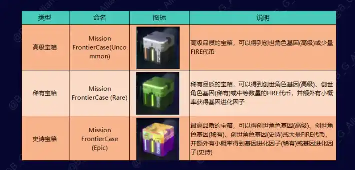 3.1.1 宝箱开启后有概率获得各种 NFT 资产或 FIRE 代币,越高等级的宝箱能获得的 NFT 资产越珍贵,FIRE 代币越多,其中创世角色基因在创世角色发行时,可以 mint 1 个创世角色,基因进化因子不仅可以 mint 角色,还能让角色具有专属的外观造型和能力