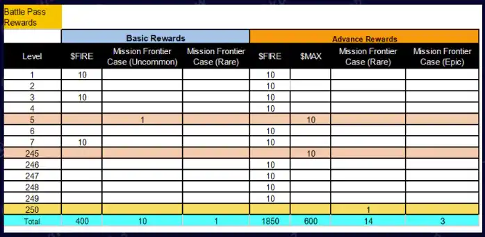 3.1 下图是 BP 任务奖励测算图,基础 Pass 卡最高只能获得 100 级奖励,高级和高级进阶款的 PASS 卡最高能获得 250 级的奖励,还会获得的更多 FIRE 代币、MAX 代币、高级宝箱、稀有宝箱甚至史诗宝箱