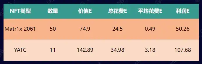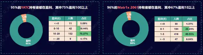 1.1 从 NFT 持有者的数据上看,YATC 和 Matr1x 2061 盈利用户达到了 95%+,几乎所有人都在赚钱,其中 YATC75% 的持有者盈利 10E 以上,Matr1x 2061 67% 的持有者盈利 1E 以上