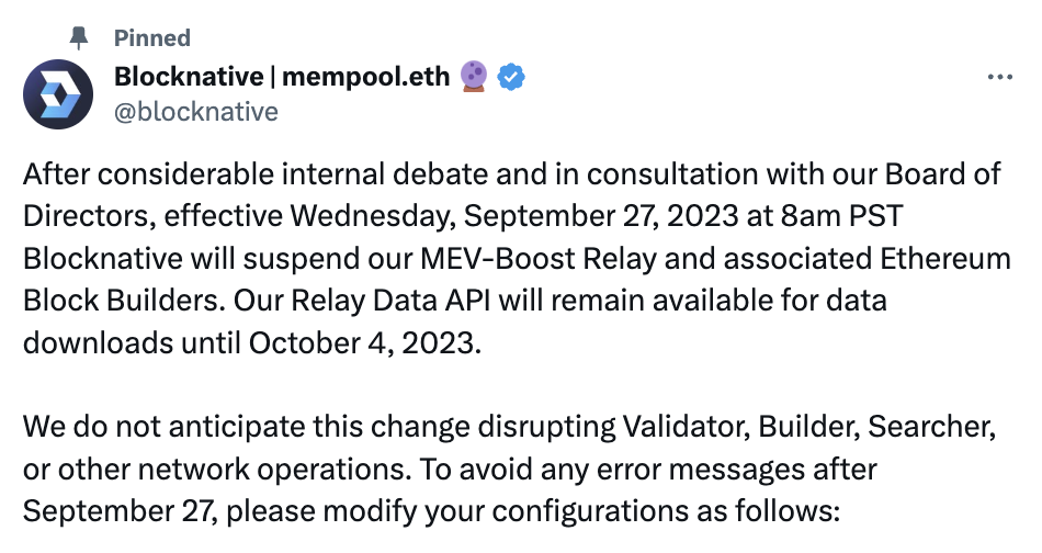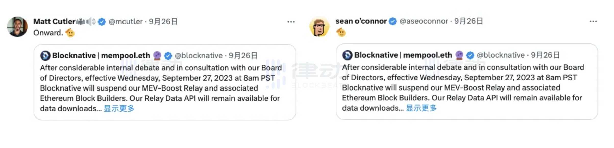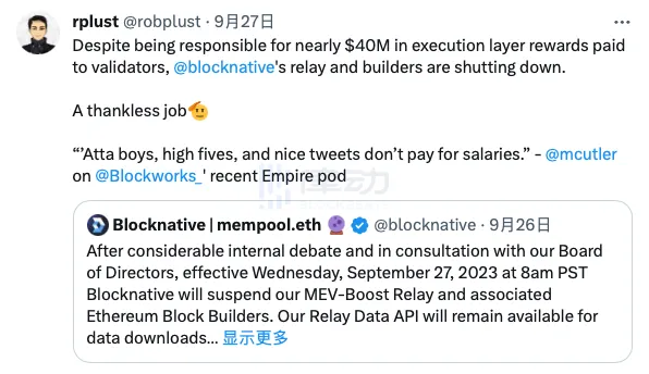 报道,9 月 28 日,以太坊基础设施服务商 Blocknative 宣布将停止其 MEV-boost 中继服务,原因是由于该业务无法维持经济效益。