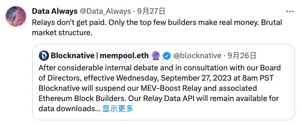 数据分析师 Data Always 在推文中指出,中继器服务没有报酬,只有排名前几的区块构建者(Builder)才能真正赚钱。这是极其「残酷」的市场结构。