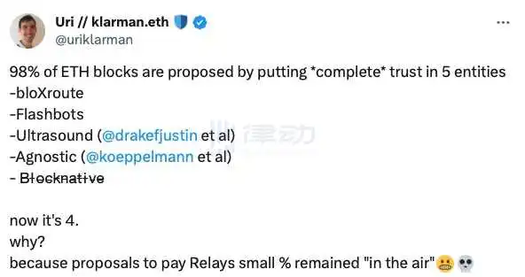 区块链工程师 Alejandro 在推文中表示,更少的中继者增加了交易的集中化。Blocknative 占区块生产的 13%,随着它的退出,Flashbot 和 bloXroute 将吃掉更多的市场份额。