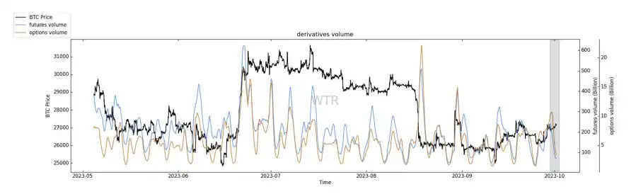 虽然价格有所拉升,但当前衍⽣品成交量⽆太多波动仍处于低位⽔平,表明当前衍⽣品交易者持观望 状态较多。