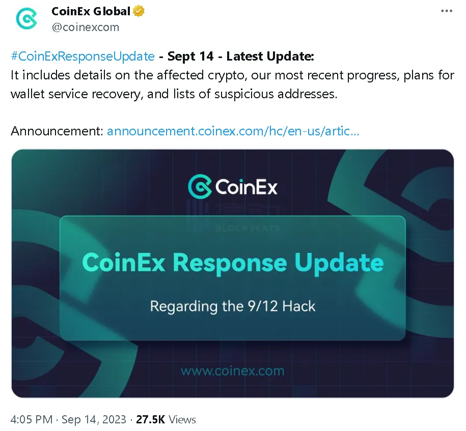 9 月 14 日,加密货币交易平台 CoinEx 发布黑客攻击事件更新称,事件原因是热钱包私钥泄露,调查处理工作正在有序进行,CoinEx 冷钱包中的资产并未受到此事件的影响。