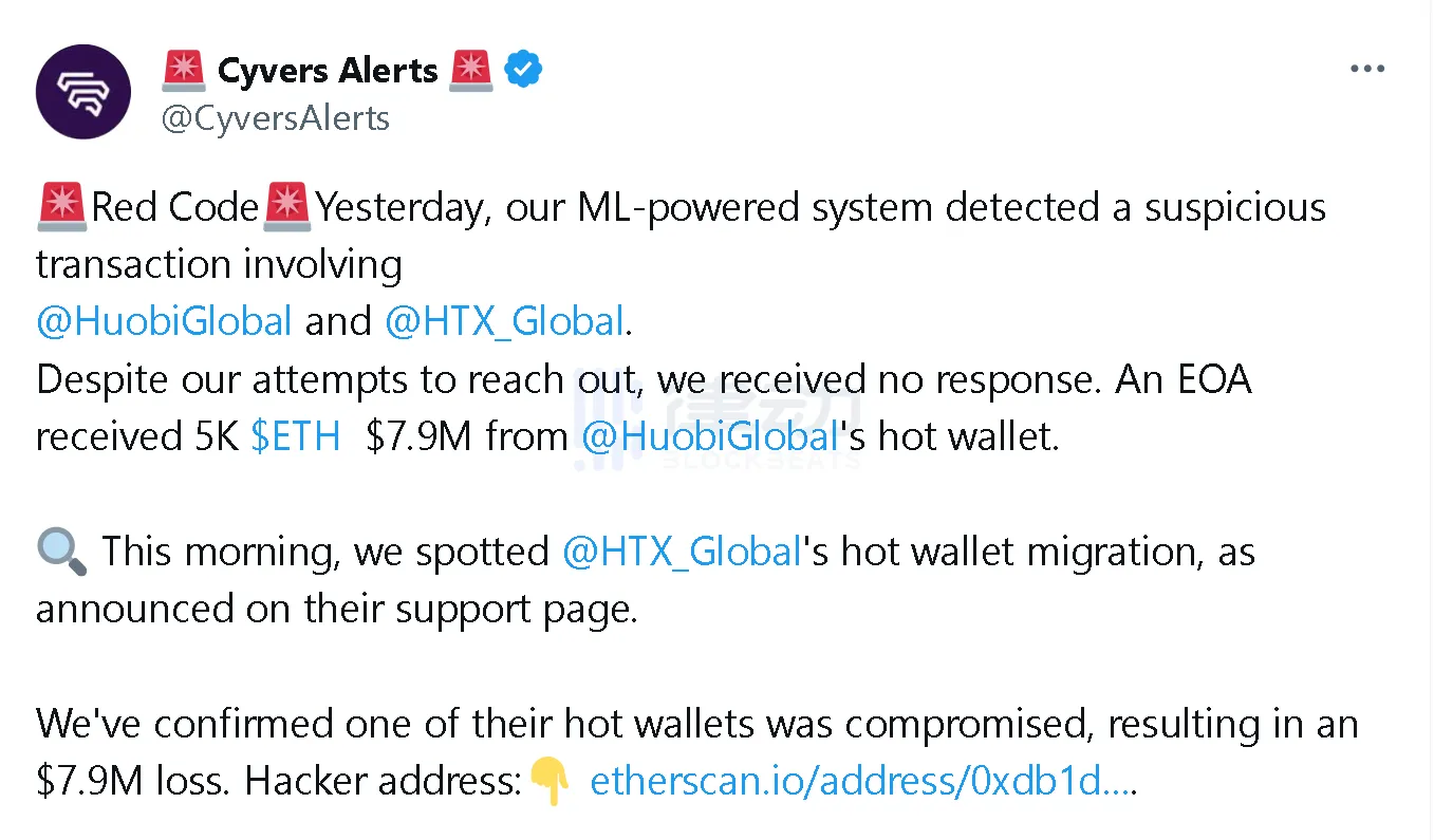 9 月 25 日,Cyvers Alerts 表示,其已确认 HTX 一个热钱包遭受攻击,导致了 790 万美元的损失。