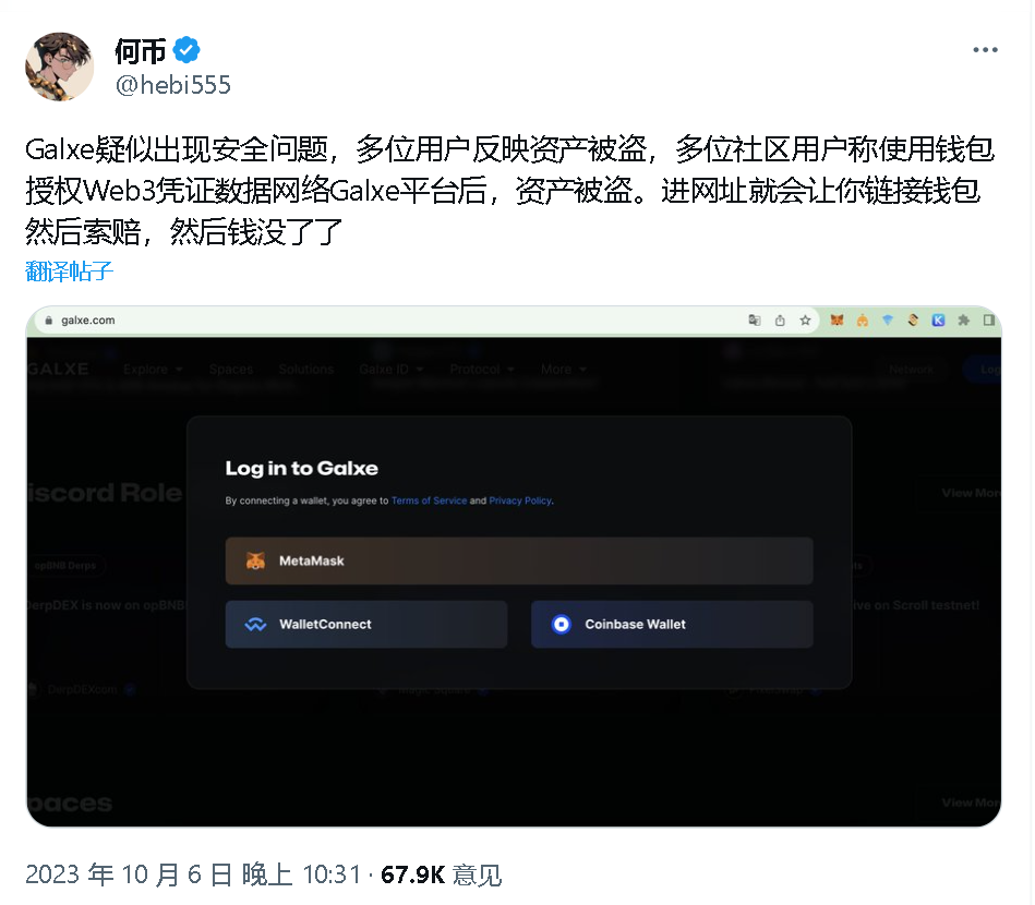 10 月 6 日,多位社区用户反应使用钱包授权 Web3 凭证数据网络 Galxe 平台后,资产被盗。Galxe 发布公告称网站已关闭,正在努力修复问题,请用户在此期间不要连接钱包到 Galxe。随后 Galxe表示发现了一起影响到官网 DNS 记录的安全漏洞,该漏洞通过其 Dynadot 帐户进行了攻击。Galxe 正在处理并采取纠正措施。请暂时避免访问官网域名。