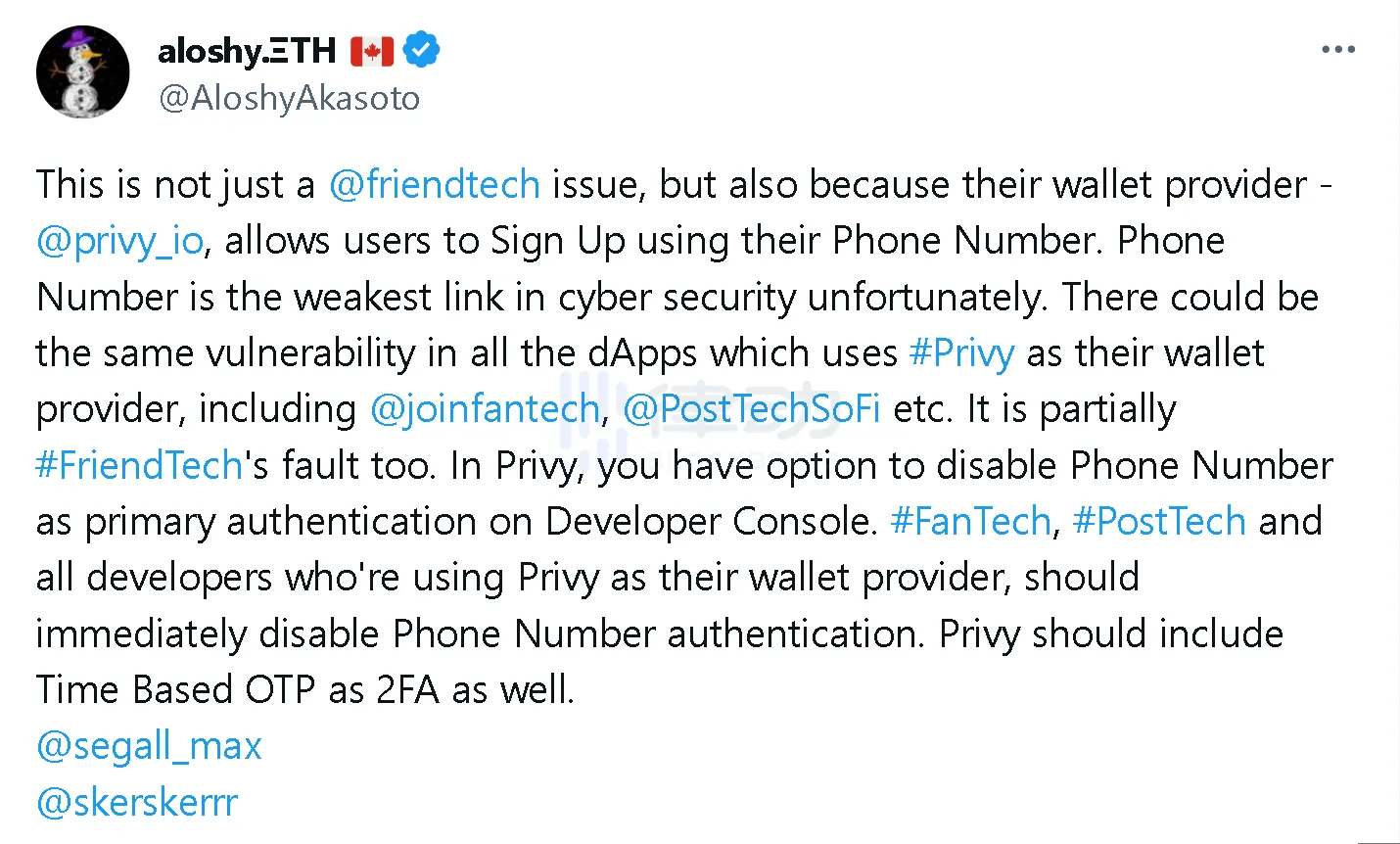 @AloshyAkasoto 对此表示,「这不仅仅是一个 friend.tech 问题,还因为他们的钱包提供商 privy 允许用户使用他们的电话号码注册。不幸的是,电话号码是网络安全中最薄弱的环节。所有使用 privy 作为钱包提供商的 dApp 中都可能存在相同的漏洞。」