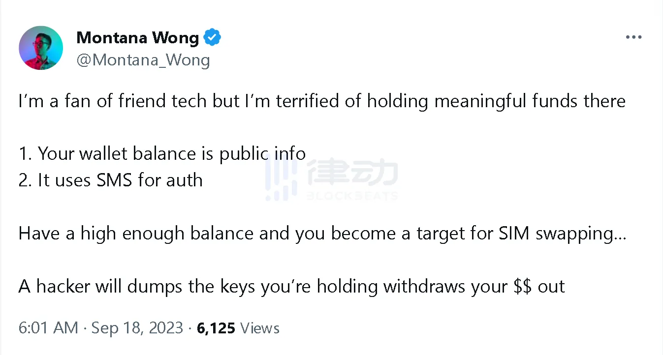 然而,早在 9 月 18 日,@Montana_Wong 就在推文中说到:「我是 friend.tech 的粉丝,但我害怕在那里持有资金。因为 1. 你的钱包余额是公开信息 2. 它使用短信进行身份验证 拥有足够高的余额,你就会成为 SIM 交换的目标……黑客会扔掉你持有的钥匙 取出你的美元。」
