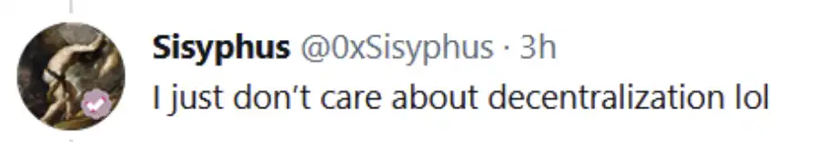 近期,面对其他社区成员对其只会「挖,提,卖」,而没有加密精神的指责,Sisyphus 表示:我就是不在乎去中心化,哈哈。