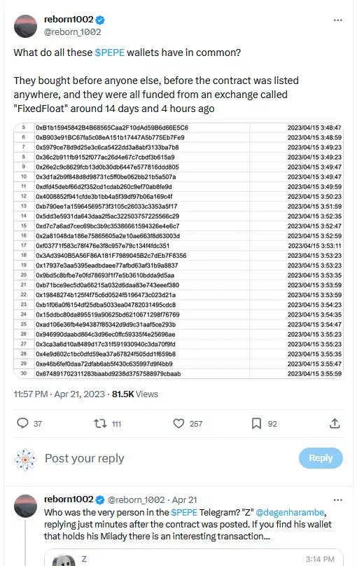 NFT Ethics 还是用了与之前一样同样的方法进行推测。在 Anubis Rug 钱包转账 3000 ETH 之后的 2 分钟内,Zim 的钱包就进行了链上交互。同时,根据 Zach 整理出的与 Anubis 事件相关的钱包列表,当列表中的钱包处于活跃状态时,Zim 正在购买 PEPE 代币。由于 Anubis 被盗资金基本上在 2023 年 7 月份前全部转出,且部分在 Zach 列表中的钱包在 PEPE 发布日(4 月 14 日)后,将资金由 Stake 转入 FixedFloat,NFT Ethics 怀疑这部分资金参与了 PEPE 的炒作,甚至 PEPE 就是因为这笔钱而被发布的。