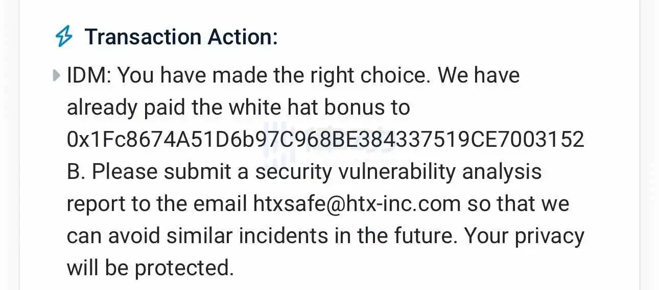 HTX 向攻击者发送 250ETH 的白帽赏金,价值 41 万美元