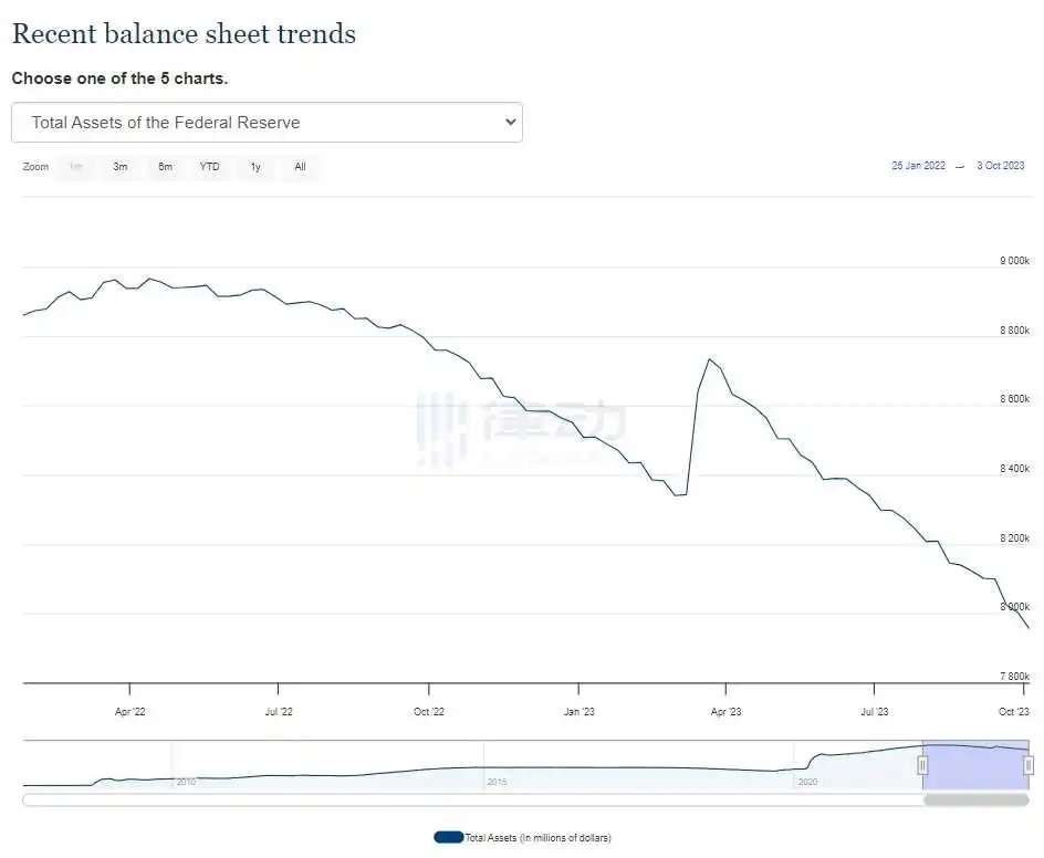 据美联储官网数据显示,截至 10 月 3 日,美联储资产负债表规模为 7.955 万亿美元,较此前一周的 8.002 万亿美元,单周缩表约 462 亿美元。