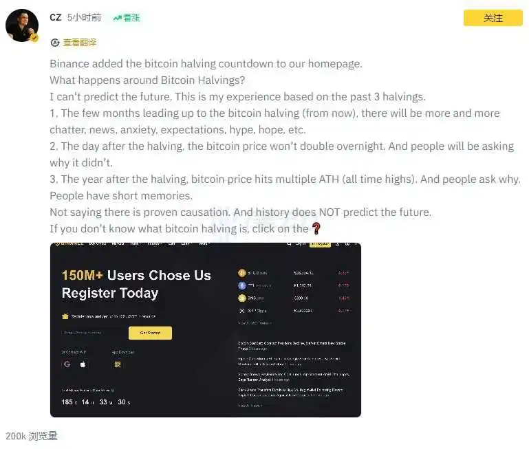 CZ 在 Binance 广场发文表示,Binance 已在其主页上添加了比特币减半倒计时显示。此外,CZ 还分享了过去 3 次比特币减半的经验。「比特币减半前的几个月里(从现在开始),会有越来越多的传言、新闻、焦虑、期望、炒作、希望等。而在减半后的一年里,比特币价格多次触及历史新高。」CZ 同时补充称,「这并不代表有确凿的因果关系,历史并不能预测未来。」