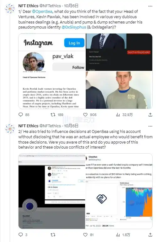 NFT Ethics 于社交平台发文披露 Sisyphus 真实身份,追踪为 OpenSea 风投主管 Kevin Pawlak。Sisyphus 曾参与各种非常可疑的商业交易(例如 Anubis)和哄抬物价。
