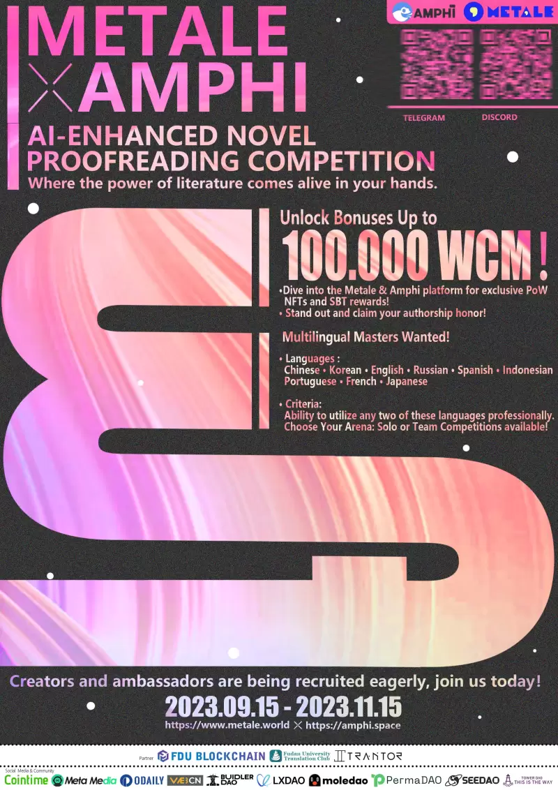 Metale & Amphi Web3+AI小说校对大赛不仅邀请了复旦大学的翻译社团和区块链协会,而且还得到了Web3各大社区媒体的积极参与。让我们携手,共同期待这场盛会,并一同探索web3、AI与翻译的未来之路。