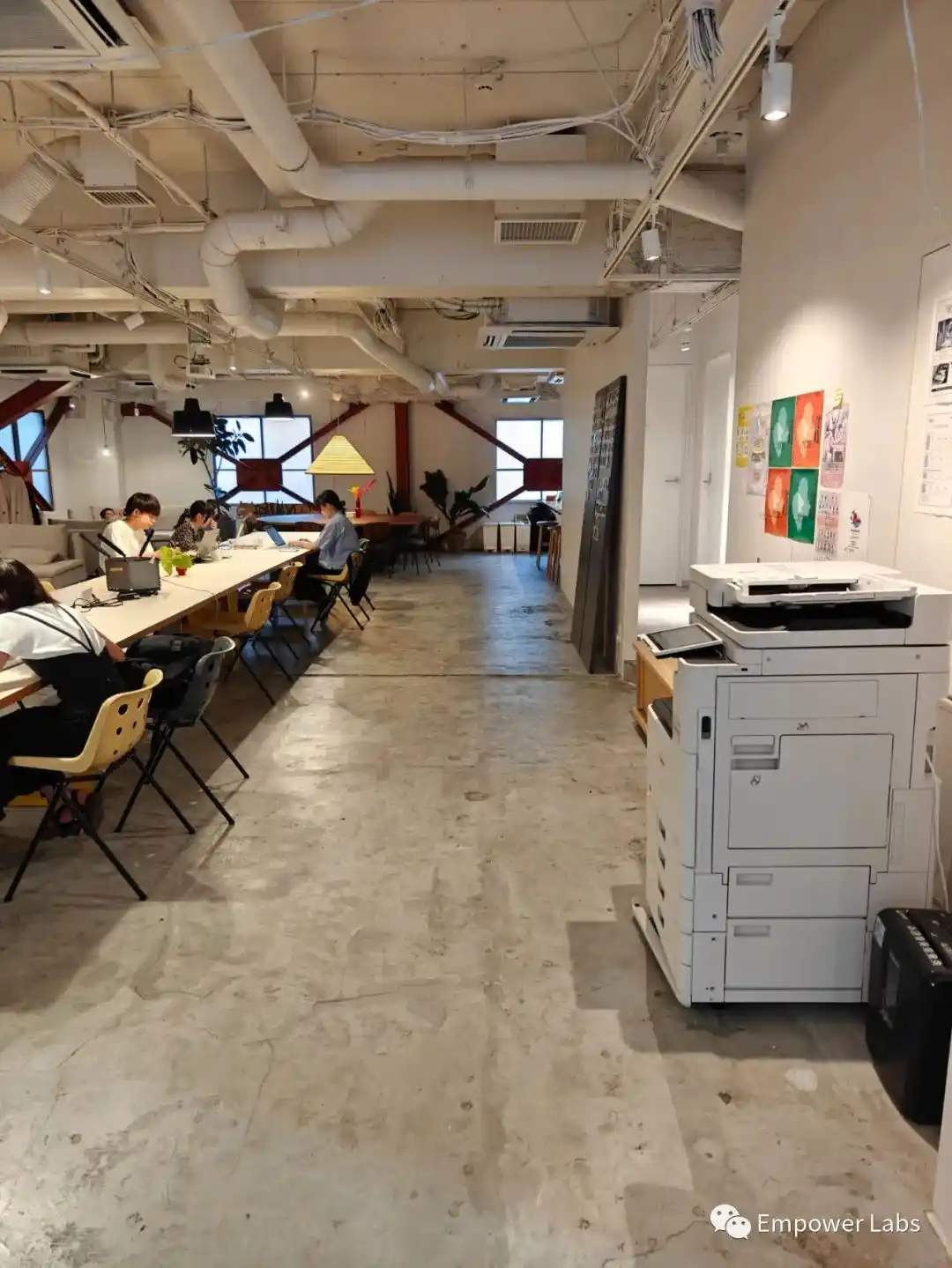 我和运营负责人提前约好了 5 点碰面,大概也是有点晚了,办公室里人不多,大家安静的在做自己的事。现场负责接待我的是一个小姑娘,形象清秀可人,英文说的也还行。她带着我转了两层,介绍了各种设施和对租客的支持。一圈转下来的感觉是硬件虽然简陋,但自在舒适。不过无论是隔间还是会议室,隔音约等于 0,只要打电话和开会,那就是正经的 build in pubic,倒也是挺符合 DAO 精神,欢迎你来听。