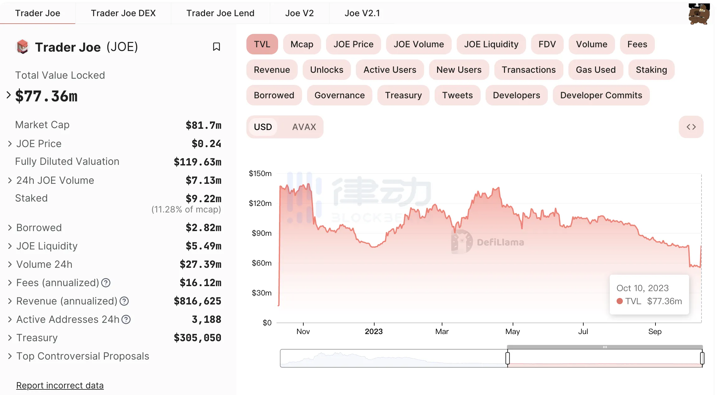 今年 8 月,Trader Joe部署至以太坊主网。此前,Trader Joe 已上线了 Avalanche、Arbitrum、BNB Chain 等网络。据 DefiLlama 数据,Trader Joe 在 Arbitrum 链上总锁仓量达到 7736 万美元,生态活跃度近期不断升温。