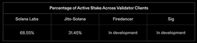 Solana 正在开发超过 4 个针对 Solana 网络的验证者客户端。除了 Solana Labs 之外,通过 Jito-Solana Client 运行的验证者比例也越来越大,几乎占总验证者代币量的三分之一。自 3 月份 Solana 基金会上次发布验证者健康状况报告以来,使用 Jito 的验证者数量几乎增加了一倍。