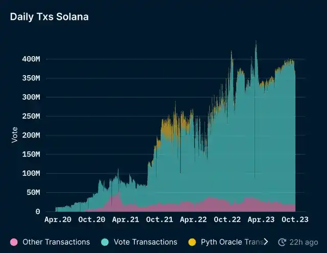 今年 Solana 的每日交易量保持相对稳定,投票交易有所增加。Solana 上的交易是投票和非投票交易的组合。投票交易链接到验证者拥有的投票帐户,包括配置、注册、投票收集和新投票签名。