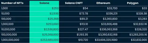 对比使用和不使用状态压缩技术铸造 NFT 的成本,在 Solana 上铸造 100 万个 NFT 的成本,在引入状态压缩之前为 253 万美元,而启用状态压缩后仅为 113 美元。相比之下,类似的收藏规模在以太坊上花费 3360 万美元,在 Polygon 上花费 3.28 万美元。