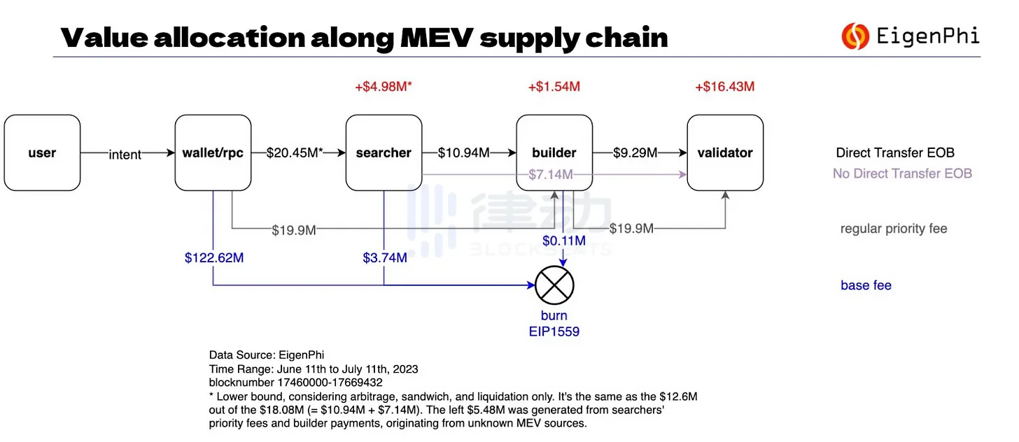 在 MEV 供应链中,另外三个参与者,即搜索者、构建者和中继器。他们通过 MEV-Boost 与验证者密切合作,目前已有 93% 的以太坊验证者运行 MEV-Boost。在这三者当中,构建者最容易形成集中化,而中继器所获得的回报最为有限。搜索者曾是所谓的超级编码者,但现在已转变为开发者团队,有些依然保持匿名状态,而另一些则成为了大型交易商。搜索者、构建者和中继器之间的经济关系错综复杂,而支付流量虽然时有发生,却因其链下性质而难以观察到。
