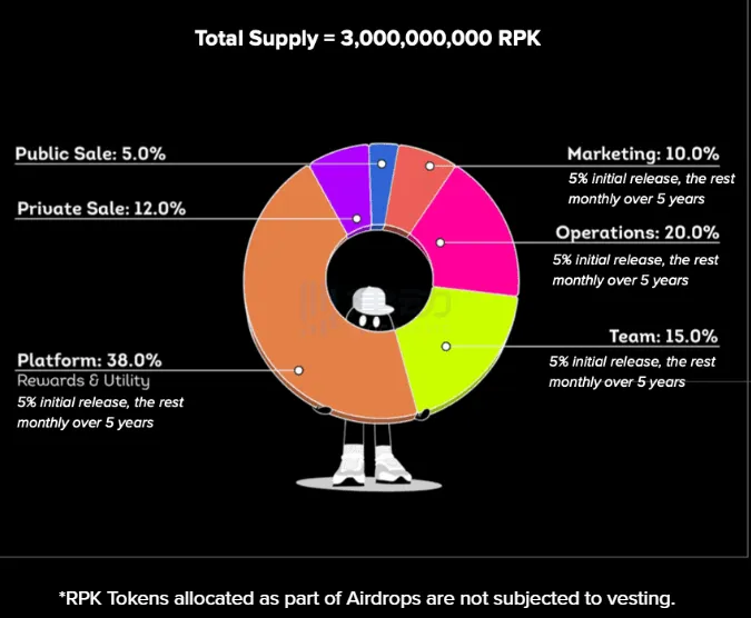 分配给创建者仍持有的代币的 RPK 奖励将作为收入直接进入创建者的 RPK 钱包。代表未来收益 3% 的 3% 被捐赠到运营平台,为生态系统的运营提供资金。