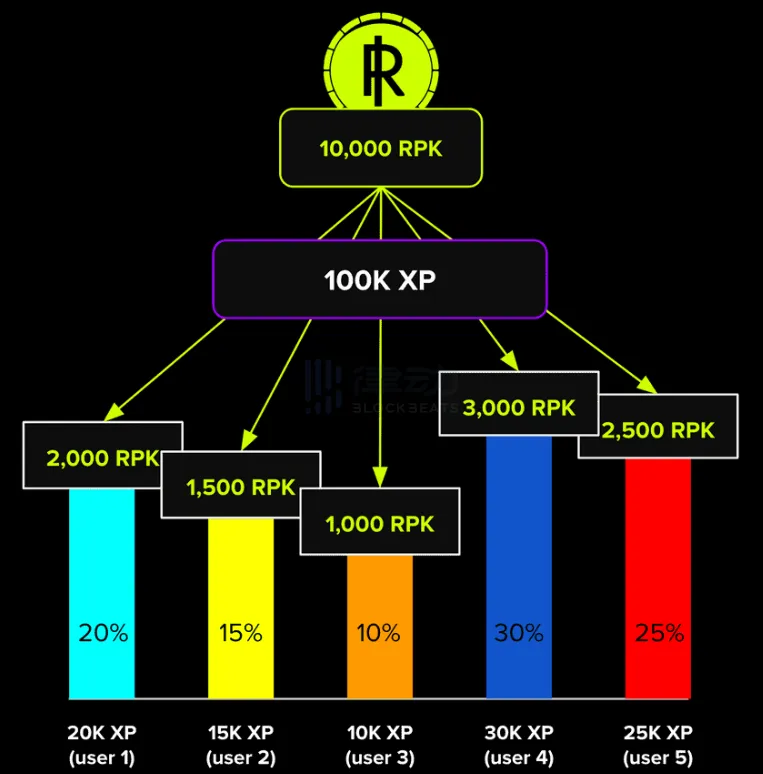 为了确保 RPK 的公平分配,根据用户赚取的 XP 相对于平台上所有用户累积的总 XP 来执行预定的代币空投。