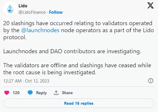 据 Launchnodes 称,该事件发生在世界标准时间 10 月 11 日下午 3:30 左右。Lido 在 10 月 11 日在 X 上发布的帖子中表示, Launchnodes 的验证器节点现已离线,在调查根本原因期间,削减已经停止。