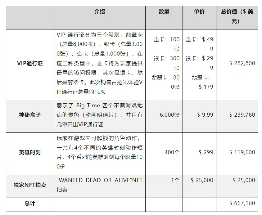 除去融资部分,Big Time 还通过多次游戏内的 NFT 道具销售活动,获得了非常可观的收入,详情如下:
