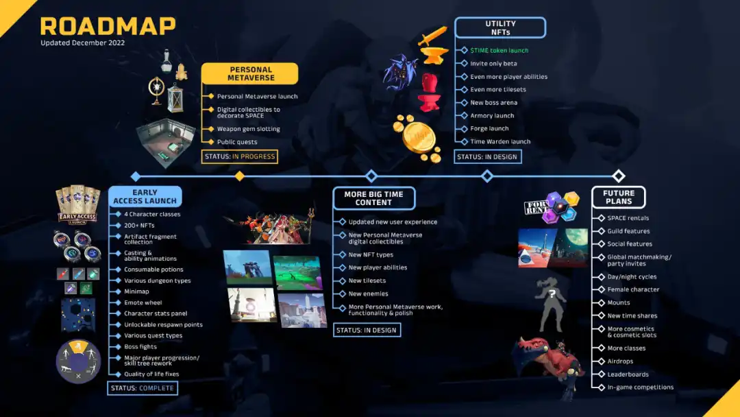 Big Time 目前仍然处于内测阶段,游戏接下来几个版本的开发重点还将集中在 BIGTIME 代币的开发和功能性 NFT 的落地上。未来 Big Time 还将更新更多的主线剧情来完善游戏的体验。2023 年 10 月 10 日,Big Time 计划开启季前赛版本,届时预计将会有大量新玩家进入到游戏当中。