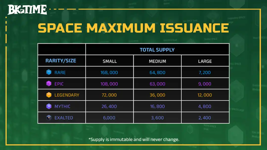 SPACE NFT 是 Big Time 当中个人元宇宙的组件,相当于其他元宇宙项目当中的「土地」。SPACE NFT 有多种大小和稀有度。SPACE 越稀有越大,它可以支持的功能就越多。