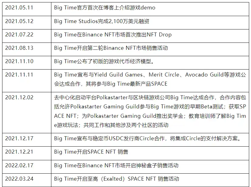 2021 年 5 月 12 日,Big Time Studios 宣布完成 2100 万美元融资,融资将分为两部分,第一部分 1030 万美元由 FBG Capital 领投,North Island Ventures、Digital Currency Group、DFG、OKEx Blockdream Ventures、Alameda Research、LD Capital、YBB Foundation、Circle Financial 和由 Ashton Kutcher 创建的 Sound Ventures 参投。此外,Big Time Studio 也完成一轮 1100 万美元的融资,这部分资金将会用来投资愿意使用相关 NFT 技术的游戏公司。