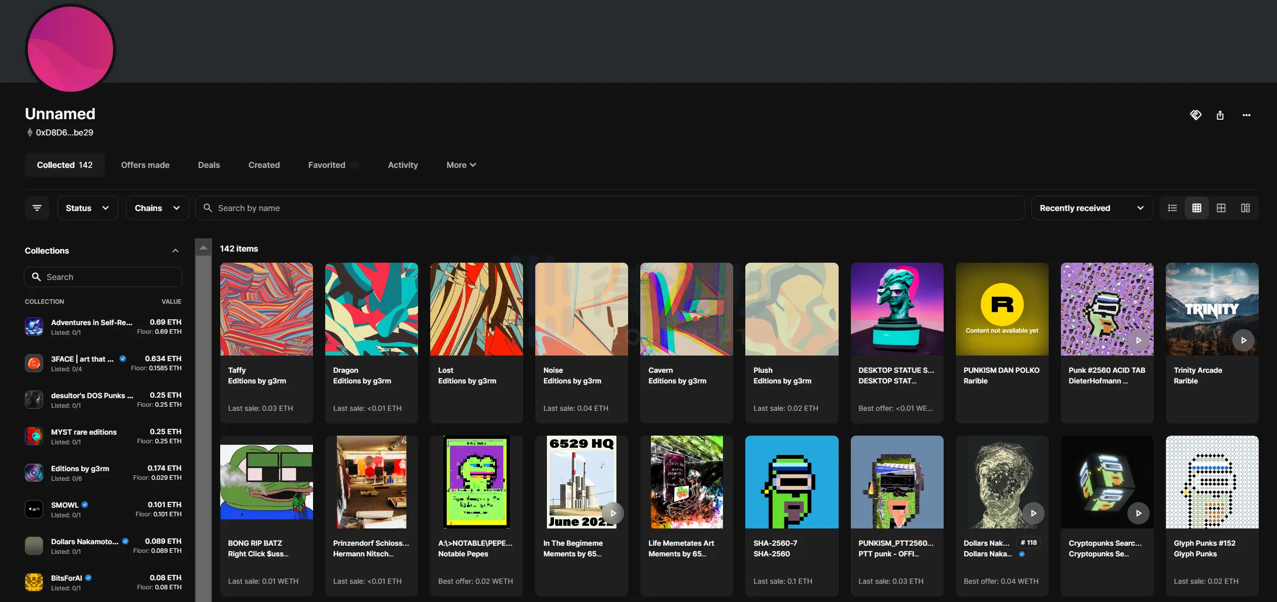 最后是一个挺有意思的插曲。如果我们检视 MoMA 的以太坊钱包,我们会发现里面除了「Unsupervised—Machine Hallucinations—MoMA 1/1」和「3FACE」之外还有一堆其它的 NFT。千万不要以此作为投资依据,这是因为 @Vince_Van_Dough 在 10 月 3 日就宣布他发现了 MoMA 的钱包地址并将地址公之于众,从而引发了一大批 NFT 人士往 MoMA 的钱包里发送 NFT...