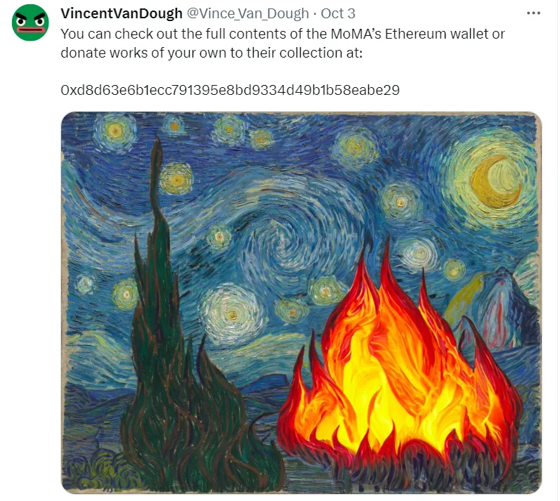@Vince_Van_Dough 在 MoMA 收藏 NFT 艺术作品之前就发现了其 ETH 地址并将地址公之于众