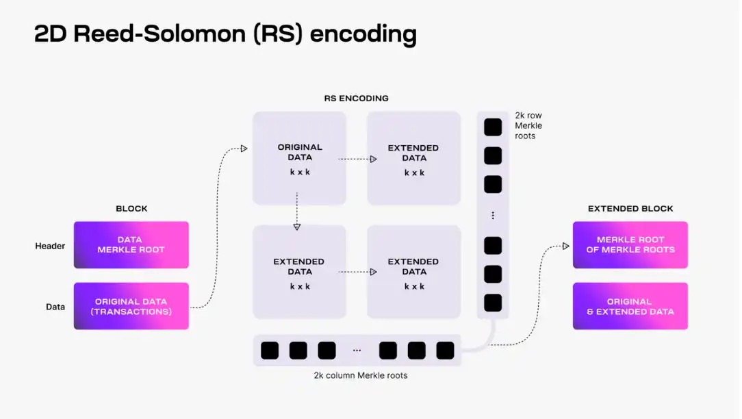解耦执行: Celestia 的逻辑是将协议分成不同的层级,每个层级专注于特定的功能,然后可以重新组合这些层级来构建区块链和应用程序。Celestia 则专注于层级中的共识和数据可用性层。与一些 Layer1 类似,Celestia 采用拜占庭容错(BFT)共识算法 Tendermint 进行交易排序,但又不同于其它 Layer1。Celestia 不会推理交易有效性,也不执行交易,只进行交易的打包排序、广播,所有交易有效性规则均由 Rollup 节点在客户端强制执行(即解耦共识层和执行层)。那么注意一个关键点,「不推理交易有效性」。也就是隐瞒交易数据的恶意区块,也可发布到 Celestia 上。所以校验过程应该如何实现?Celestia 在此引入了两个核心,二维 Reed-Solomon 编码与 Data Availability Sampling (数据可用性采样,简称 DAS)。