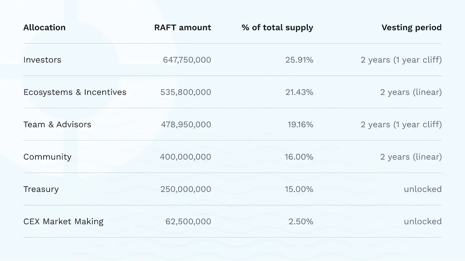 LSDFi 协议 Raft 推出原生代币 RAFT,社区份额占总量 16%,生态系统及激励份额占 21.43%