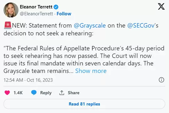 据报道,10 月 15 日,Grayscale 发表声明,指出 SEC 寻求重审的 45 天期限已过,这意味着法院将在 7 个日历日内发布“最终授权”。