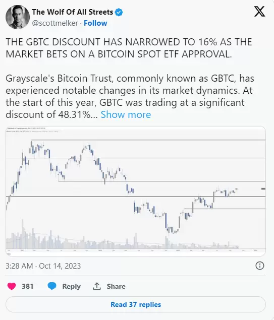 由于市场押注比特币 ETF 获得批准,灰度 GBTC 折扣降至 16%